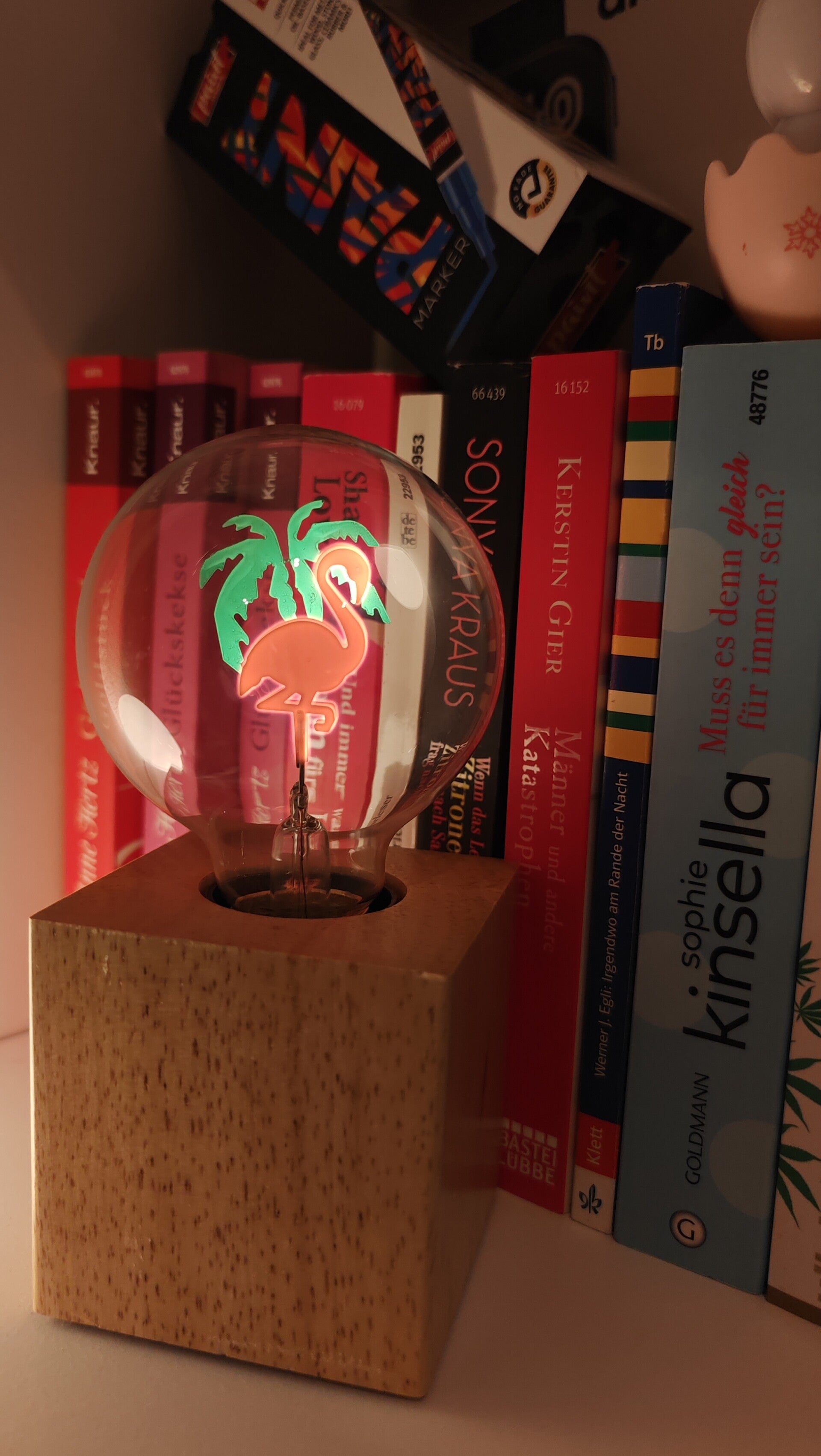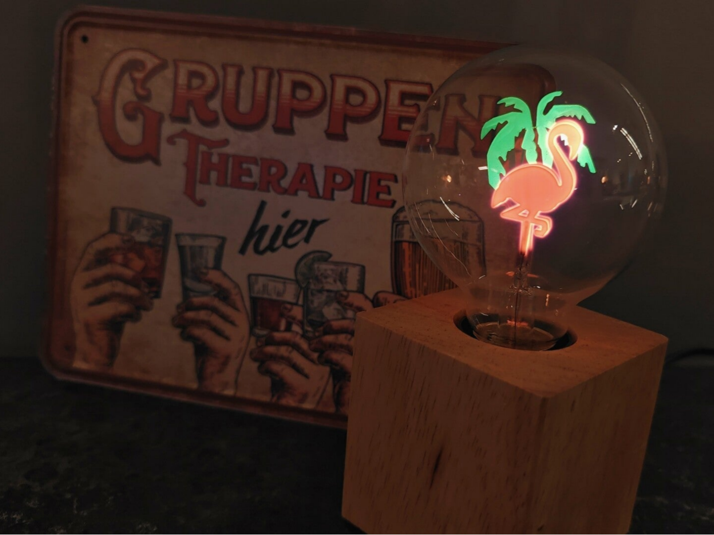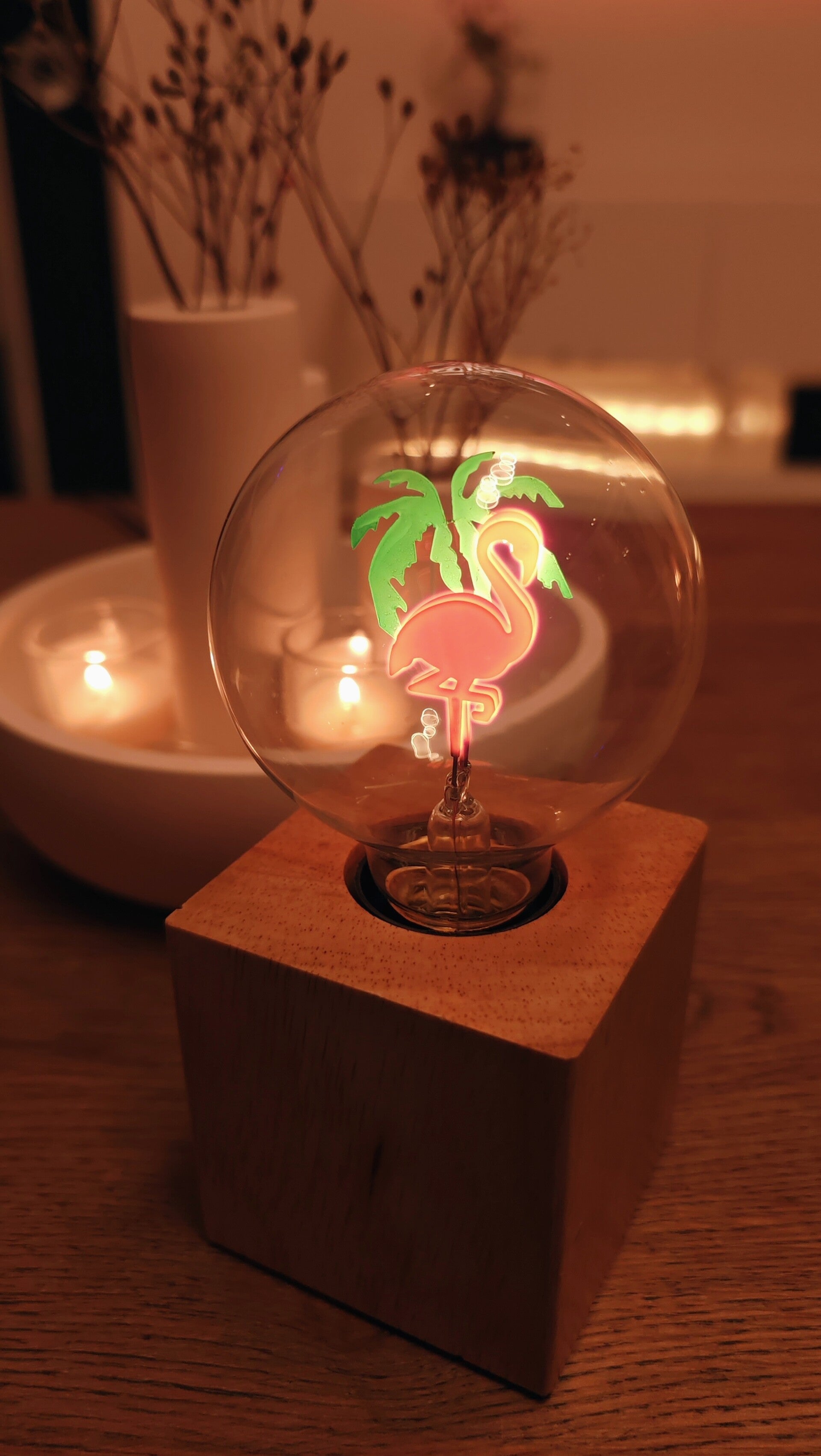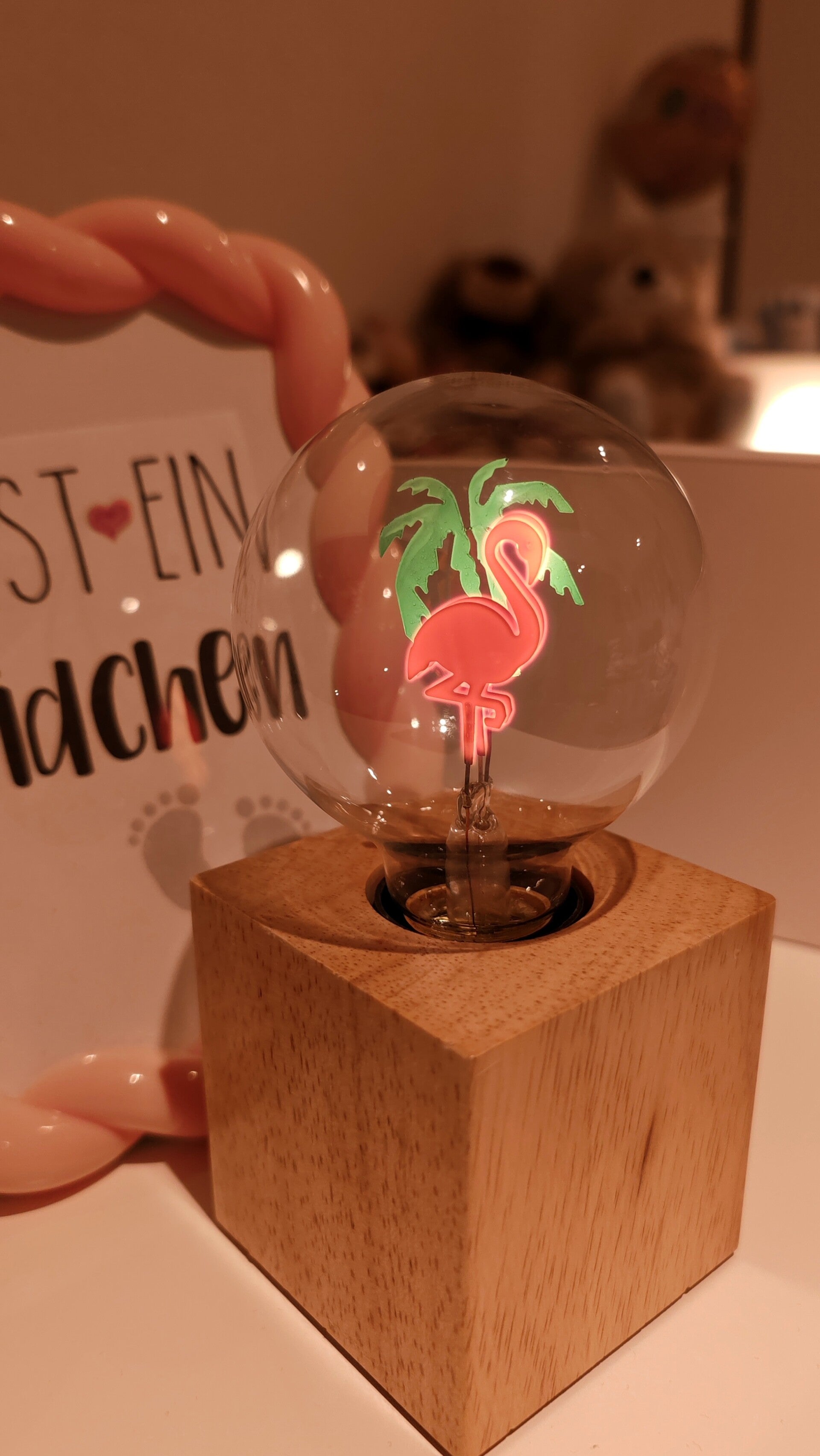 Wer es exotisch und sommerlich mag, findet in diesem Flamingo-Palmen-Duo das perfekte Motiv. Diese handgefertigte Glimmlampe ist weit mehr als eine gewöhnliche Glühbirne; sie ist ein kleines physikalisches Wunder, bei dem echtes Licht zum Glimmen gebracht wird.