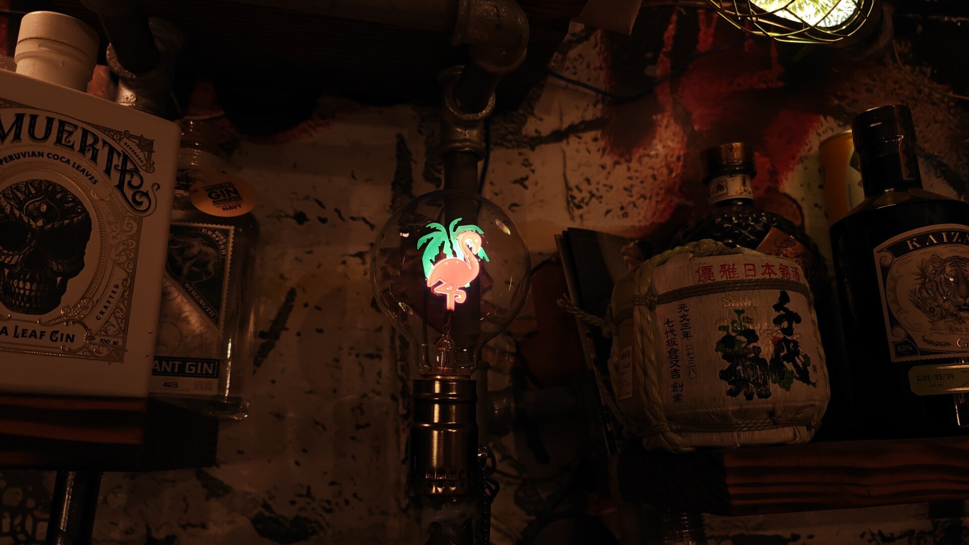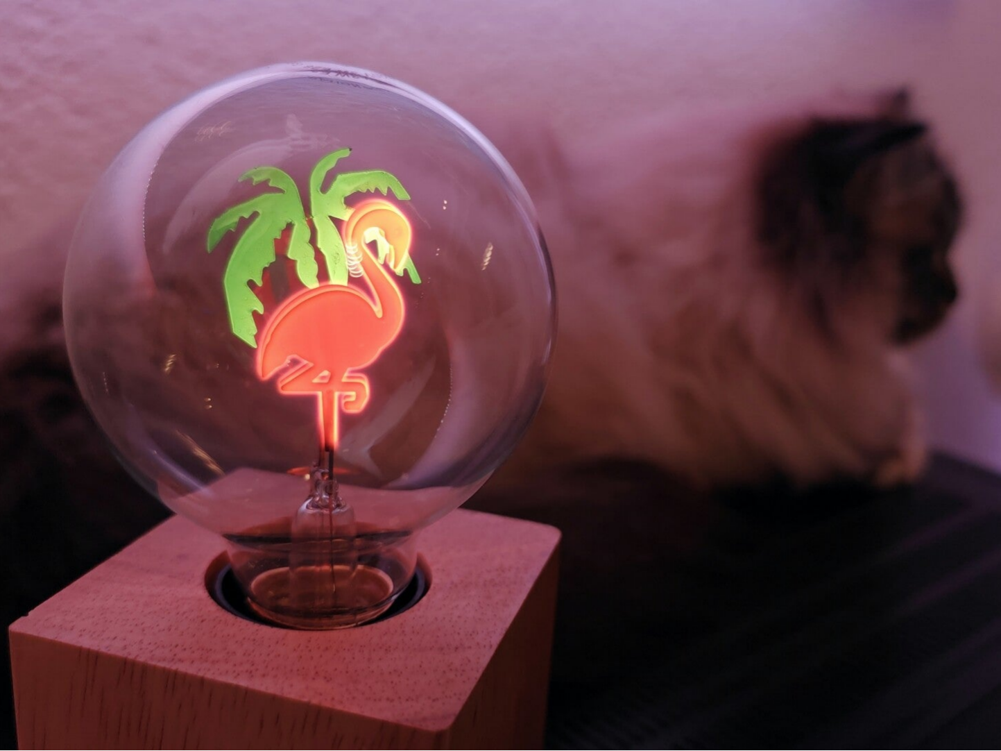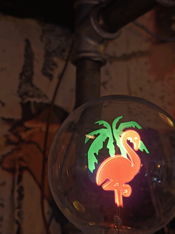 Im Gegensatz zu modernen LEDs nutzt diese Gasentladungsröhre echtes Noble Gas (Edelgas), um einen rosaroten Neon-Flamingo und eine grün phosphoreszierende Palme im Inneren des Glaskolbens zum Leben zu erwecken. Das kunstvolle Filament sorgt für einen faszinierenden Glow-in-the-dark Effekt, der den Raum in sanftes Licht hüllt.